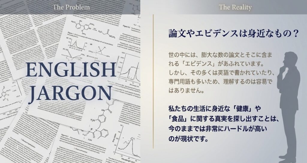 世の中には、膨大な数の論文とそこに含まれる実験データなどのエビデンスがあふれています。しかし、その多くは英語で書かれていたり、難解な専門用語も多いため、理解するのは容易ではありません。特に私たちの生活に身近な「健康」、「美容」、「栄養」などに関するエビデンスを探し出し、役立つ情報として整理するのは、非常にハードルが高いのが現状です。