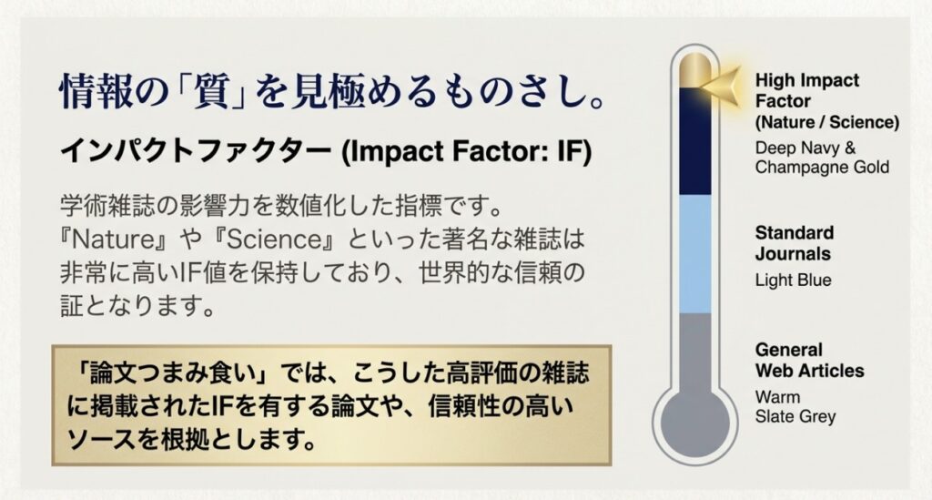 情報があふれている現代では、その内容が信頼できるかどうかを見極めることが大切です。その判断基準の一つが「インパクトファクター(Impact Factor:IF)」です。これは学術雑誌の影響力を数値で示したものです。たとえば『Nature』や『Science』のような著名な学術雑誌は、専門家による非常に厳しい査読(いわば専門家による審査)を通過した論文だけが掲載されます。そのためインパクトファクターが高く、世界的にも信頼性が高いと評価されています。