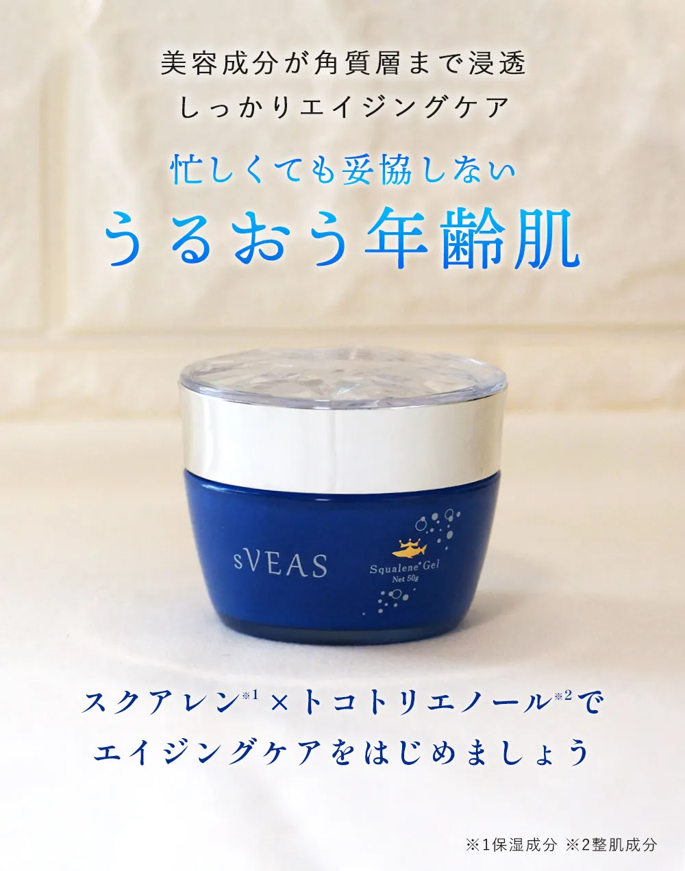 時短で手軽にエイジングケア*が出来るオールインワンジェルです。年齢とともに減少する肌の保湿成分「スクアレン」を補給し、潤いをチャージ。さらに、肌を美しく整える「トコトリエノール」配合で、若々しくハリのある素肌へ。美肌に欠かせない保湿成分アミノ酸、セラミドをはじめ、大人気成分CICAエキスなど整肌成分を贅沢配合しました。パッチテストとスティンギングテスト済みで、敏感肌の方でも使用できる低刺激設計です。忙しくてもエイジングケアを妥協したくない方、以前より肌の乾燥やくすみが気がする方におすすめです。1つ5役(化粧水・乳液・美容液・パック・クリーム)で摩擦も1/5に軽減できるスキンケアアイテムです。