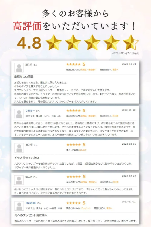 業界初!「スクアレン」と「トコトリエノール」の独自レシピ。年齢と共に頭皮と毛髪からから減少する「スクアレン」を補って潤う新発想の天然アミノ酸スキンケアトリートメント。「スクアレン」×「トコトリエノール」で頭皮環境を整え、健康で艶のある美しい髪を育てます。さらに、11種のアミノ酸とはちみつ配合で頭皮と髪に潤いを与えます。